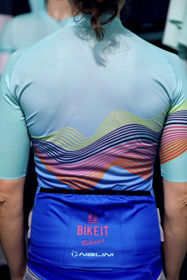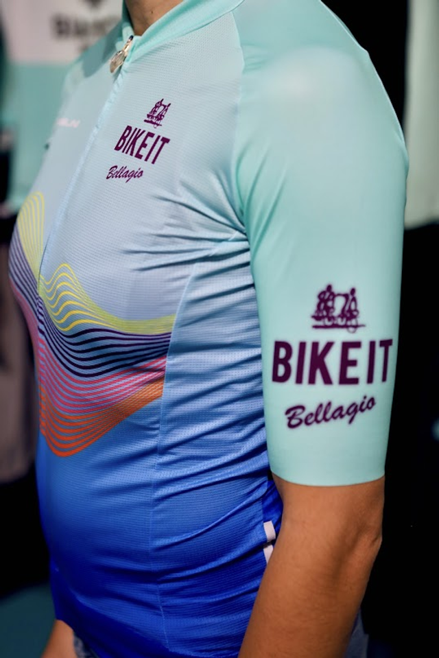 Bike It! Bellagio Race Style Cycling jersey featuring colors reminiscent of Lake Como. Check out the matching socks, cap, buff, and gloves!- Breathable fabric- Reflective band above pockets- 3 back pockets- elastic waist band h. 45 mm- long, hidden zipper